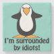 Jag är omgiven av idioter! Lustigt och sarkastiskt insulin med svart och vitt penguin med orange fötter och beak grafik med en turkosa blå/grönt bakgrund cyan färg.Fullständigt anpassade.