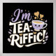 Utformningen har den skarpa frasen "Jag är TEA-Riffic!" "TEA" i ord är ett lekfullt sätt att ta sig an ord "fantastiskt". Texten är en blandning av typsnitt, med "I'm" i ett glitterätt skript för lila och "TEA" och "Riffic!" i ett fet, stiliserat teckensnitt med en gyllene skugga. En tecknad-stil-te kopp med ett lycklig-ansikte är inkapslad i texten och ångan stigning från den i form av guldhjärtan. Hela designen är dekorerad med små löv, blommor och stjärnor, vilket ökar dess visuella charm. Den svarta bakgrunden gör att det varma färg och den varma gnistran framträder. Det skulle vara en perfekt för mugg, t-shirt eller poster.