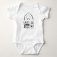 Den vita babybodyn "jag behöver lite mjölk"-grafik, förstärkt med en minimal regnbåge och en illustrerad barnflaska. En modern, söt och könsneutral design, perfekt för både babypojkar och -flickor.