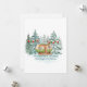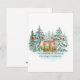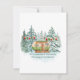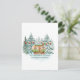 Jag drömmer om julcamping i skogen med en bild av en husbil omgiven av julgranar på ett julkort.
