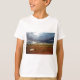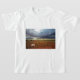 Lone rider leksak (ett flygplan) i öknen fält av rött smuts över ett vidsträckt, obrutet landskap under stormiga himlar. I avstånd bryter sol genom stormmolnen.