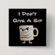 Lägg till en stänk i åsna i stil med den här "Jag Ge inte en sip"-knapp i Mugg! Den här djärva utformningen är en perfekt för koffein älskare som inte är rädd för att visa lite attityd. Den har ett löjligt moody kaffe kopp med korsat arm och ett träsk. Den vackra frasen ovanför mugg säger allt - perfekt för att fästa på jacka, ryggsäckar, tote bags eller anslagstavlor.