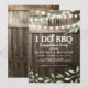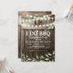Rustika "jag gör BBQ"-parförlovningsfestinbjudningar med lantlig bakgrund av tunnor i trä, gnistrande sladdbelysning, botanisk grönska akvarellbladverk, förlovningsring, din monogram och en mall för firande av par som är lätt att anpassa.