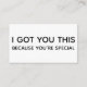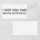 Ibland vill man göra sig av med formaliteterna och klippa till jakten. Ibland föredrar du och din stam ett men av humor framför dina speciella tillfällen. Kortet för presenthöljet är till för dig. På två linjer står det: "Jag har dig detta eftersom du är speciell." Baksidan är tom så att du kan skicka ett personligt meddelande till skrivan. Helt redigerbart kan du ändra teckensnittet eller dess färg eller färg i bakgrunden. Om du känner dig så benägen kan du till och med ändra meddelandet. Det är ditt kort. Gör det själv! designad av Melody Watson för Pappra Muserie.