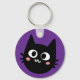 Lönsam nyckelkedja för lila med en svart katt av komisk tecknad med stort runt ögon och rosys rosa-kinder i en doodle teckning art stil. Den här nyckelkedjan är designad med din kontaktinformation på baksidan med ett meddelande om att du har en katt som väntar hemma.
