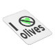 Jag hatar oliver. Designen använder svarta bokstäver, ett grönt hjärta och den internationella "NEJ"-symbolen för att uttrycka "Jag hatar oliver". För de som inte "älskar" dem, verkligen ogillar dem, men har en humor och älskar att skratta och bli ticklade.