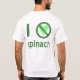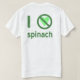 Jag hatar spenat. Designen använder gröna bokstäver, ett grönt hjärta och den internationella "NEJ"-symbolen för att uttrycka "Jag hatar spenat". För dem som inte "älskar" det, verkligen ogillar det, men har en humor och älskar att skratta och bli retade.