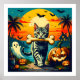 Den här designen fångar en lekfull Halloween äventyr: ett smart tabby katt stolt parad längs ett månbelyst väg och klämmer ihop ett gigantiskt humerusben i munnen. Bakgrunden är en spricka i färg som tidigare har fallit tillbaka, som kastar skuggor från handflatan träd och fyller himmel med fladdermus på ett livligt sätt. Över hela världen... en jack-o-lyktor, en bubblningskauldron, ett hemsökt hus och ett vänligt spöke satte scenen för magisk missöde. Det är ett firande av nyfikenhet, mystik och smart humor - där kattdjurets bravado och vetenskapens pun möts i en festlig, spännande värld som inbjudan både skrattar och .