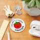 Lustigt, rund, röd tomat med grönt löv, ett stort lycklig leende och punkter för öga. I svart text böjd ovanför och under tomaterna står ord "I kärlek du från mitt huvud tomater".