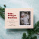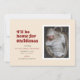 Den här julens tematiska gravid-meddelande innehåller ord "Jag kommer att vara hemma till jul" skrivet i ett rött stil-teckensnitt. Det finns utrymme för ett foto av porträtt-storlek och för ditt nyfödda namn och födelsestatus. Baksidan har en feströd röd grönt och mönster.
