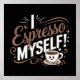 Det här är en lekfull och smart grafisk design som troligen skapas för kaffe älskare. Konstruktionen har den skarpa frasen "I Espresso MYSELF!" Texten står i ett fet, öga-fångstande stil med ett glitterbrunt struktur för ord "Espresso". Brev är en blandning av elegant och ren typsnitt. Ett litet kaffe tecknad-stil med ansikte i lycklig placeras vid grund, omgivet av kaffebönor och små hjärtan, och tillsätter ett sött och charmerande inslag. Den svarta bakgrunden gör att det varma bruna, vita och guld färg står ut. Det skulle vara en perfekt för mugg, t-shirt eller poster.