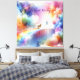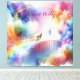 Jag möter dig vid Regnbågsbron. Akvarellillustration En fantasifull, drömlik scen som visar en färgrik, eterisk Regnbågsbro som sträcker sig över ett fantasifullt landskap fyllt med mjuka, virvlande moln i levande nyanser av blått, rosa och gult. Atmosfären är lugn och magisk och inger en känsla av undran och frid, omgiven av skimrande stjärnor och ljusspår som förstärker scenens förtrollande känsla.