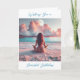 En vacker kvinna som bedrar sig på en strand med vit sand och glansigt glas. Önskar en vän eller familjemedlem en fredlig fullt av kärlek, ljus och frid.