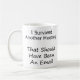 Grattisar - du har mött ännu ett meningslöst möte! Fira din överlevnad med superskojet "Jag Överlevt ett annat möte som skulle ha varit ett e-postmöte" mugg. Perfekt för kaffeavbrott, passiv och aggressiv skrivbordsdekor, eller gåva till medarbetare som får det. A must-have för vem som helst som navigerar i kaoset i företagslivet eller ändlösa Zoom-samtal