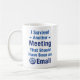 Börja din dag med ett skratt och en nod till den allmänna kampen för arbetsplatsmöten med vår lustiga novelty mugg! Med frasen "Jag Överlevt ett annat möte som borde ha varit ett e-postmeddelande" fångar mugg perfekt den frustration vi alla känner när tiden slösas i onödiga möten.