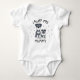 Jag älskar min Mamma - Söt valp Baby-bodysuit för nyfödda, spädbarn och bebisar. Denna söta unisex, ett-delars babybodysuit är den perfekta presenten för en babyshower till någon blivande mamma eller en ny babypresent till en mamma med en ny babypojke eller babyflicka som kommer att kalla sin mamma för Mummy istället för Mamma. De söta, neutrala färgerna på babykläderna visar en liten grå valp med en större grå hundmamma och silvergrå stjärnor. Den ett-delade babybodysuiten säger "Jag älskar min Mamma" ("I ruff my Mummy").