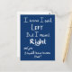 Det här superskojets blåa vykort är perfekten till pappa, pojkvän eller vänner som inte kan motstå ett bra-argument över riktningar! "Jag vet att jag sa LÄMNAT, men jag menade HÖGER och du borde ha vetat det!" - detta lekfulla vykort fångar den humoristiska frustrationen att få borttappad i en köroenighet. Det är idealiskt för dem som inte kan hjälpa utan vara höger - även när de uppenbarligen inte är det. Ett roligt och ett fräckt skämt, det blåa körkortsargumentet får henne att skratta. Det är en perfekt som har tänts hälsning till med de direkt utmanade nära och kära i ditt liv, skapat av The Sweetmans!
