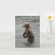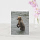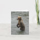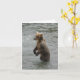 Detta vykort fångar ett serene men mäktigt ögonblick i Katmai nationalpark i Alaska. En brunbjörn från mor ligger tålmodigt i vatten precis under Brooks Falls, och tittar ivrigt för lax. Det är en klassisk bild av Alaska vildmark, som visar björnarnas ihärdiga försök att mata sig själva och sina unga.