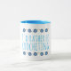 Ett vackert blått och vitt mugg, med texten "Jag skulle hellre vara kroketing", dekorerat med två rader turkos och rosa garn, vardera en elegant träkrokett krok. Det är en idealisk gåva till alla som kärlek, garnhantverk, hantverk eller skapar.
