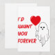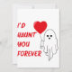 “Jag skulle hemsöka dig för alltid” med en spökande figur som håller i en hjärtformad ballong.