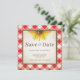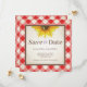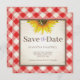 Meddela din speciella dag med den här hjälpen spara datuminbjudan, perfekt för ett sommartema i bröllop eller mysiga fall i firande. Med en fet gult solros, röd gingham mönster och vintage bakgrund, fångar den här designen charmen av bröllopsinbjudningar och trädgårdssammankomster. Gingham fortsätter på baksidan och binder ihop det land-inspirerade utseendet. Idealisk för jag gör BBQ-händelser och solrossbröllop, det här sparar datumet anger tonen för ett varmt och glatt firande. Köp mer från temat bröllop i sommar på https://www.zazzle.com/collections/i_do_bbq_wedding_theme-119271283573540516