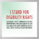 Texten lyder: "Jag står för höger för funktionshinder: tillgänglighet, säkerhet, acceptans från samhället, oberoende och livskvalitet, fullt och aktivt deltagande i samhället, lika tillgång till utbildning och sysselsättning".