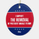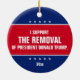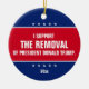 Jag stöder avskaffandet av president Donald Trumps plan. Säg till världen att du är för att hindra och avlägsna president Donald J. Trump med den här julprydnaden. Och se till att ringa era senatorer och tala om för dem var ni står. Konstruktionsbeskrivning: En blå bakgrund med fem stjärnor överst och grund. I mitten, en röd sektion med en vit gräns överst och grund. I mitten i den röda sektionen, ord, stöder jag att president Donald Trump tas bort, med vit stil.