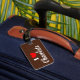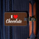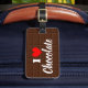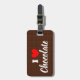 Jag tar resgodsbrickor för väskor och väskor. Teckning för att märka bagage för att förhindra förluster på flygplatser med hjälp av roligt-resenärers offertutformning. Mörk Choklad pub-design för resor med manar, kvinnor och barn. Gör det lätt att se dina tillhörigheter på bagaget bälte. Anpassningsbarna är ilsken med personlig namn och adress. Omfattar läderband. Lägg till ditt humoristiska ordspråk. Cute presenter för choklad älskare, vänner, bröllop-par, choklad, narkomaner, honungsmooners, affärsmän m.fl. Stor fet skripttypografi brev med röd kärlek-ikon.