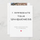 Visa din make, pojkvän eller speciella någon med ett fotokort på Alla hjärtans dag som firar just sak som gör dem till din enda, och bara: deras unika charm! Den här eleganten visar ett modernt kort tonen med ett djärvt "Jag uppskattar din unika"-meddelande i förväg, som pekar på det hjärtlösa ord som anpassningsbarnas bakåtmeddelande kommer att innehålla. Bild här: ett omhuldat foto av er två, som fångar den romantiska gnistan, smittsam skratt eller fånig flint som fyller ditt hjärta med glädje. Under den, öppna ett anbudsförfarande i kärlek brev fyllt med personliger, skämt inne och alla skäl till att deras frågor och allt gör att man beklagar dem. Det här enkla men fantastiska kortet är inte bara en dag . Det är en uppskattad keepsaké som de kommer att hålla efter att chokladen är borta.