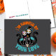 Dessa sockerskallekatter är inte bara kusliga – de är hopplöst hemsökta av kärlek. Detta udda Halloween- vykort visar två skelettkatter med stora ögon och en mycket modig liten mus, med frasen "Jag hemsöks av din kärlek" som sticker ut mot en djärv mörkgrå bakgrund. Det är det perfekta sättet att skicka Halloween-kärlek till någon som förstår din kusligt söta sida. Baksidan innehåller ett enkelt "GLAD HALLOWEEN"-meddelande, vilket ger gott om utrymme för din egen kusliga (eller bedårande) hälsning.