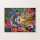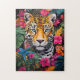 Ett nära porträtt av en jaguar med piercing blå ögon, inramad av vibrerande tropisk löv. Hårdarens päls är en slående blandning av gult, svart och vitt, som skapar en fetstil mot lush grönt löv och ljusa rosa blommor. Bilden fångar djurets intensiva blickar och antyder en känsla av makt och mysterium.