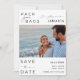 Vår Jamaica-målbäckenbröllop Rädda datumkortet fångar kärnan i ditt romantiska badbröllop. Fotot ram i mitten visar en vacker bild av paret lycklig, som ger en skymt av din kärlek-berättelse och andningsinställningen där du utbyter vows. Anpassa med din bröllop-information och e-post till familj och vänner - säg "Packa dina väskor" eftersom vi ska till Jamaica!