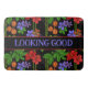 Svart badrumsmatta mönstrad med ackee-frukter, tropiska blommor och gröna palmblad. Tvärs över mitten står citatet "LOOKING GOOD" som kan anpassas så att du kan lägga till din egen text, eller ta bort den om du föredrar det