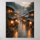 Step into the peaceful charm of a traditional Japanese street scene with this atmospheric vintage-style illustration. The artwork captures a quiet lantern-lit alley in a historic Japanese village during a gentle rain, where warm glowing lights reflect beautifully on the wet stone pathway. Wooden houses, hanging lanterns, and misty forested hills create a serene and nostalgic mood inspired by classic Kyoto streets and traditional Japanese architecture.