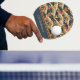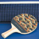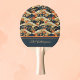 This retro look ping pong paddle features a Japanese style print -- similar to patterns from kimonos -- with white, teal, tan, and orange on dark teal-- almost black. Your name monogram appears in gold text on a coordinated color block of dark blue teal, bordered by two orange stripes. This vintage look Asian style design is beautiful and sporty.