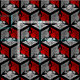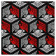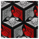 Tyg i ett japanskt kimonomönster för klassiker av stylized kranar som är ordnat i ett mönster av sexhörningar, in djupt - rött, lätt och medelgrått/grå färg, på en svart bakgrund