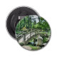 En pikturesk japansk bågbro spänner lätt över en stillastående damm, vars elegant reflekterar i det stilla vatten nedan. Bron är omgiven av lush greenergiy och innesluter den tidlösa skönheten hos japansk trädgårdsestetik.