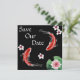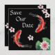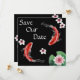 Denna inbjudan från bröllop spara datum fångar Japans skönhet. Den har en vacker svart bakgrund med två Koi-fiskar som simmar omgiven av en liljefad och blommor. Koi-fisk symboliserar kärlek i Japan.