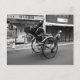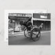 Ett svart och vitt foto av en rickshaw som transporterar två turister genom Kyotos gator.