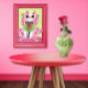 Dekorera väggarna i stil med den här unika, färgstarka folkkonsten poster! Japanska Maneki Neko, eller Beckoning Cat, som är mycket populärt i Japan, anses ge sin ägare ett överflöd. Den används ofta i feng shui, tillverkas i många olika stilar och färg och visas ofta i japanska ställe av företag. Den vanligaste övertygelsen är att om kattens lämnat tass upphöjs lockar den till sig hjälpsamma människor, kunder och företag, och om högerna tass upphöjs drar den till sig lycka till och rikedom. Om båda tassar upphöjs drar de till sig båda. I denna nyfikna, giriga konst, är denna vackra rosa Maneki Neko täckt med ro och bär en gyllene klocka på hennes halsduk och ett hjärta på hennes halsduk. En rosa Maneki Neko tros också locka till sig kärlek, och hon bär de japanska tecknen för "lycka" på sin mage.