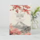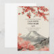 Denna bröllopsinbjudan har ett japanskt landskap med en traditionell struktur med sakuraträd i närheten och ett berg i bakgrunden.