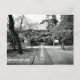Svartvit foto av träd och väg i en japansk tempelträdgård.
