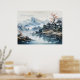 En japansk vattenfärg i stil från ett stort hem som ligger i vissa sten och träd vid högernas avrinningsområde i sjö eller flod. På andra sidan vatten finns en liten gräslig utkant med en liten kajplats för att binda upp en liten båt.