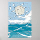 Japanskt Vintage Sjölandskap med fiskmås som flyger över havet.