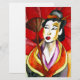 med originalkonstform från vattenfärgsmålning av japansk Geisha i kimono med röd paraply och gult bakgrund. Ljusstark och färgstark, inspirerad av orientalisk och asiatisk konst, kommer detta vackra dam från Kyotoområdet i Japan.