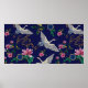 Japanska kranar, vågar och blommor. Embroidery ill Poster
