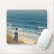 En solitär japansk kvinna som är klädd i historisk stil står på en sandig dune som ser på det stora serenhavet vågar i en ukiyo-e-genre