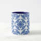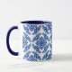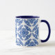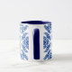 Mugg i ett klassiskt japanskt kimono mönster av stiliserade, fyraåriga medallioner av löv och blommor i djup koboltblått på vit bakgrund
