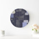 Mörk blått rund väggklocka med traditionell japansk sashiko-tryckt design som liknar stift och plåster.