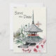 Denna inbjudan från bröllop spara datum fångar Japans skönhet. Det har en vacker naturlig bakgrund med ett målat japanskt buddhistiskt tempel, bambu och grenar av en körsbärsblommar träd.